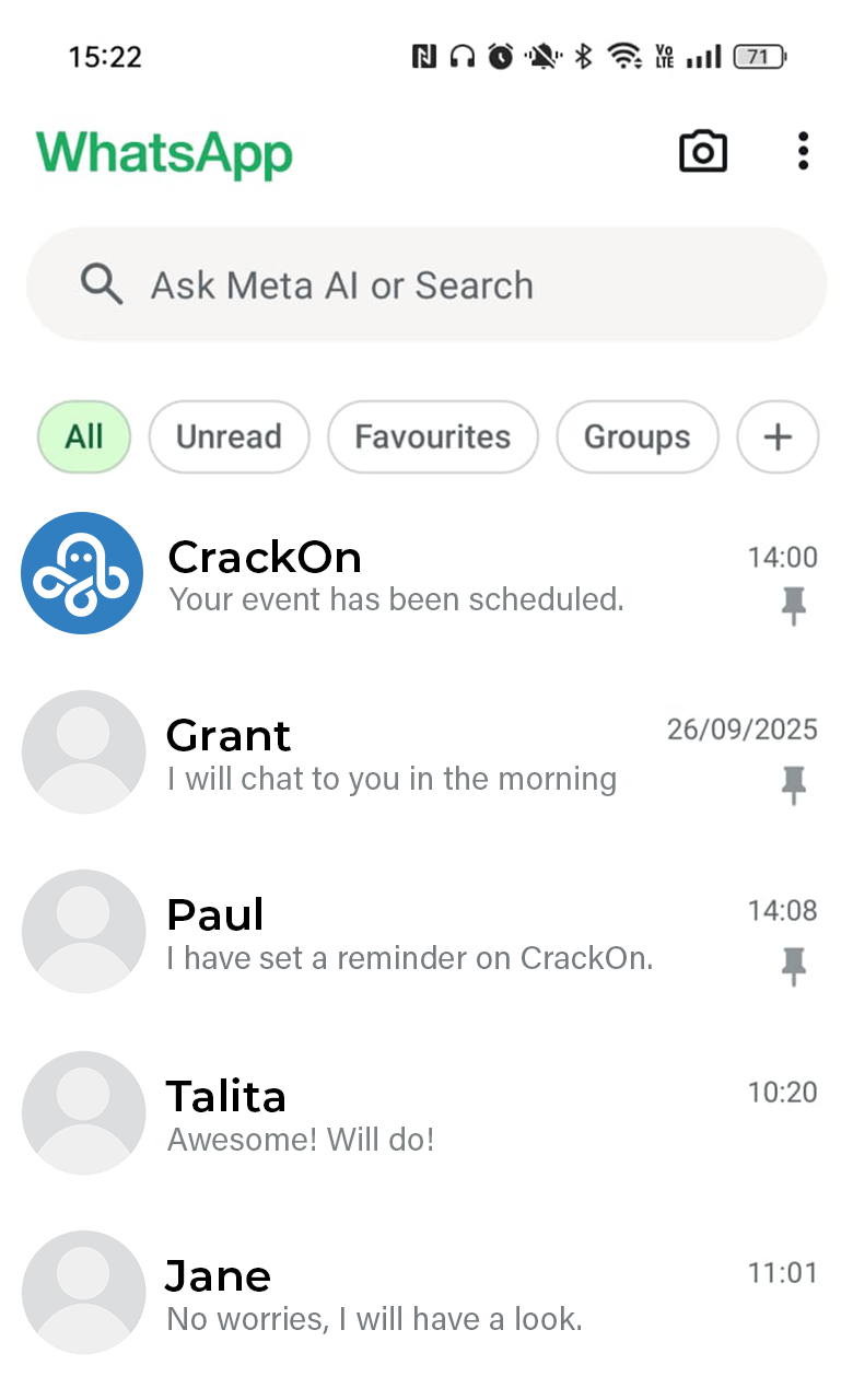 With CrackOn, you can quickly send a voice note or text message, and it will automatically sync with your calendar. From school pickups and family appointments to team meetings and coffee catch-ups, CrackOn ensures you never miss a moment. It’s effortless, reliable, and fits naturally into the way you already communicate, right inside WhatsApp.